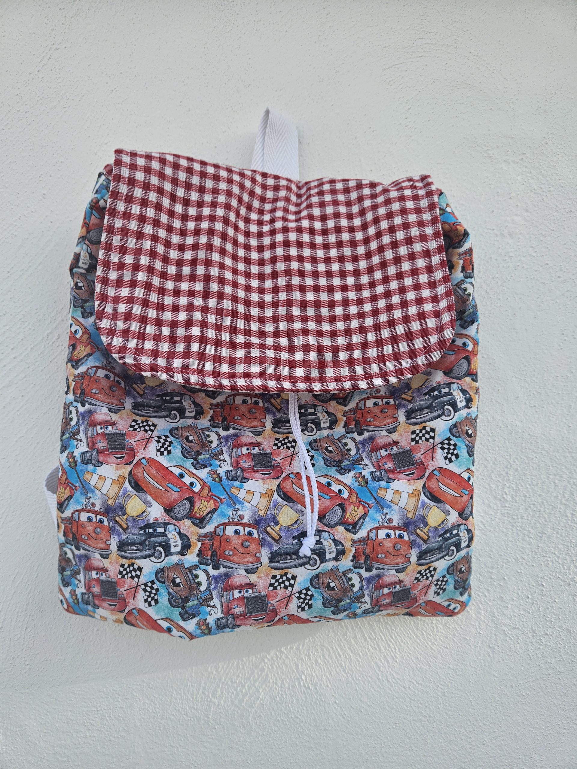 Mochila escolar con estampado de Cars combinada con solapa en tejido de cuadros en rojo y blanco. Además, puedes AÑADIR EL NOMBRE. Hecha a mano, personalizada. Para cualquier duda, contacta con nosotros.