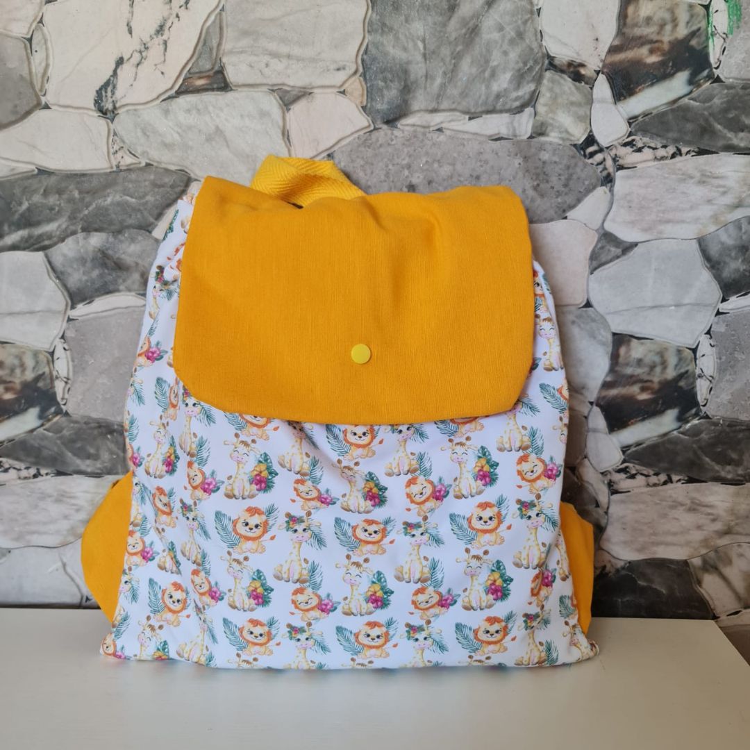 SKU: 624-mochila-solapa-amarillo-animalitos-selva-flores Category:Mochilas