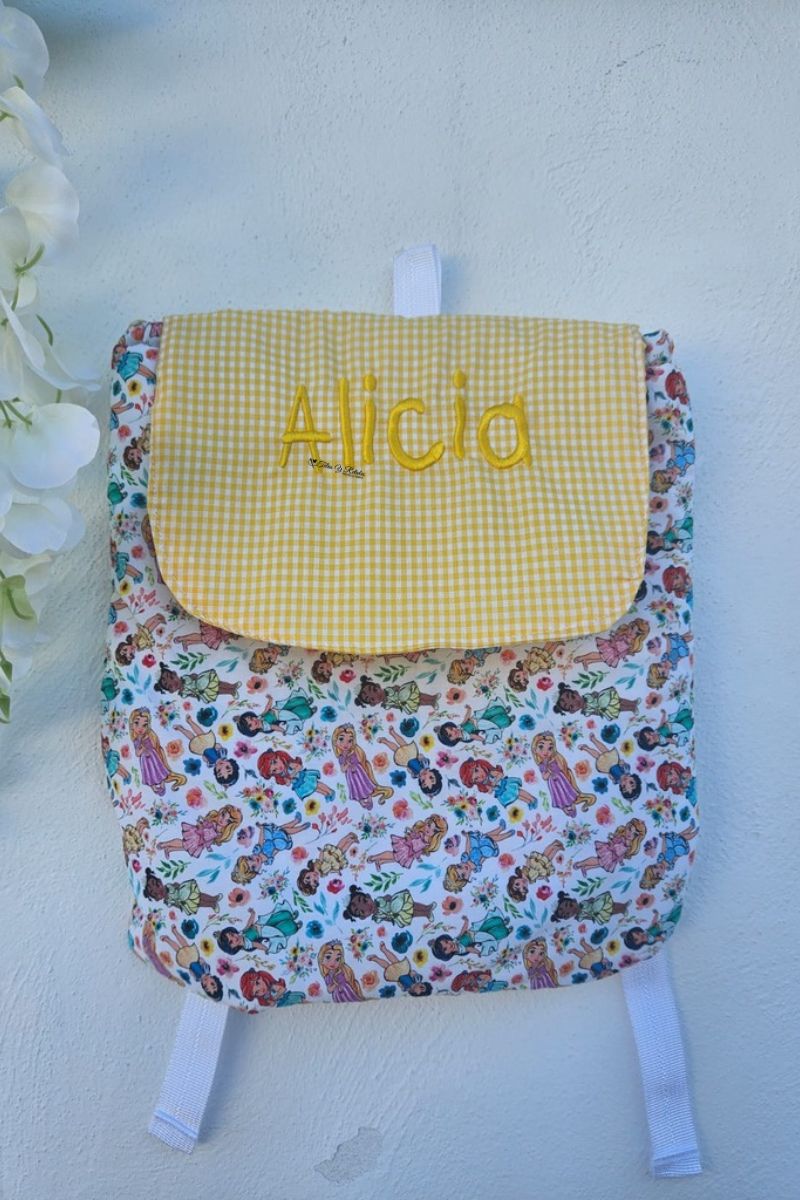 Mochila escolar de las princesas Disney, combinada con solapa en tejido de cuadro vichy de color amarillo. Además, puedes AÑADIR EL NOMBRE. Hecha a mano, personalizada. Para cualquier duda, contacta con nosotros.