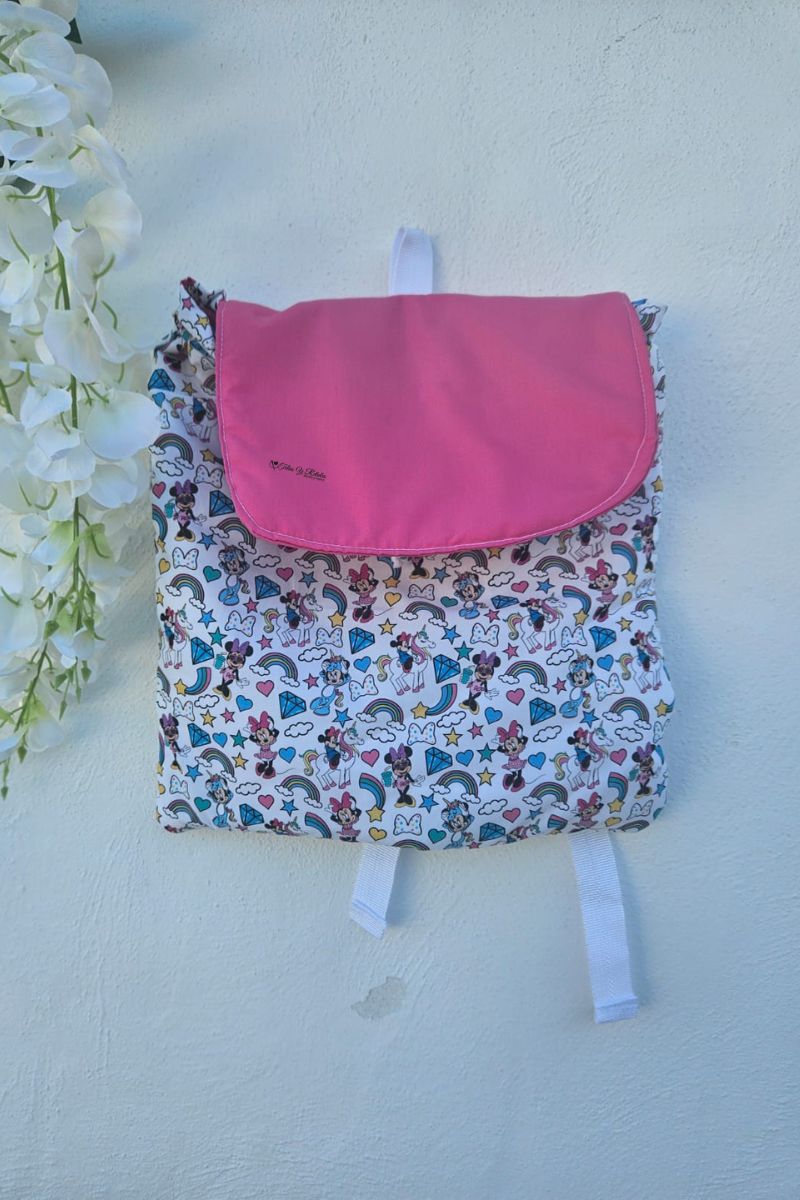 Mochila escolar de Minnie Mouse, combinada con solapa en tejido de color rosa. Además, puedes AÑADIR EL NOMBRE. Hecha a mano, personalizada. Para cualquier duda, contacta con nosotros.