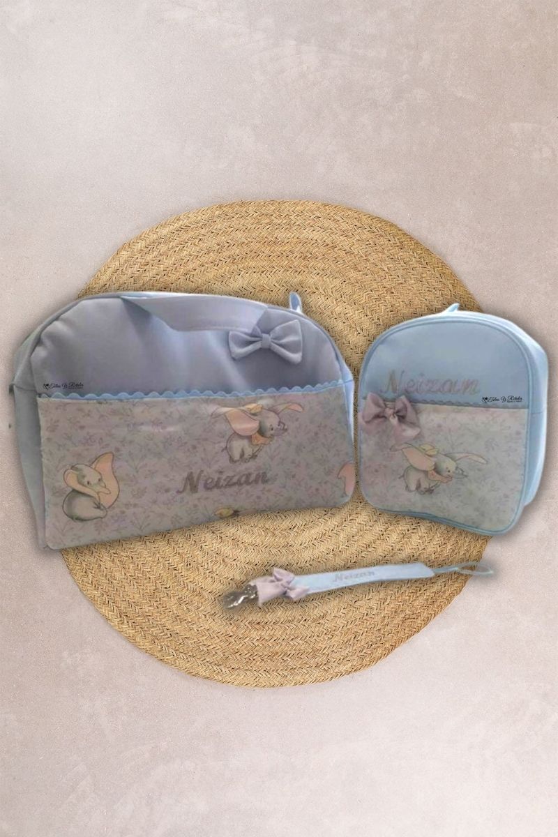 Pack bolso de maternidad, mochila y cuelga chupete celeste personalizado Dumbo