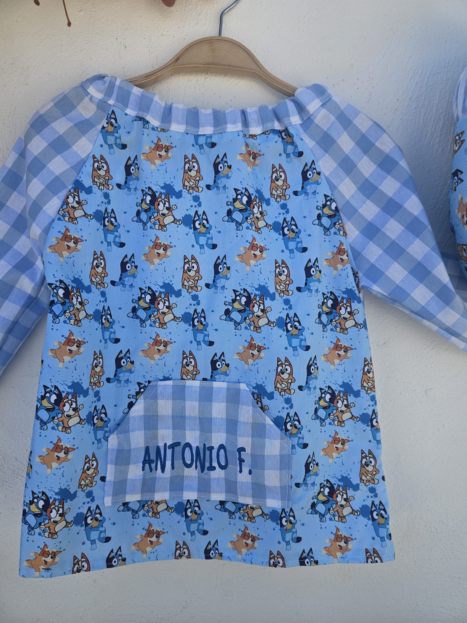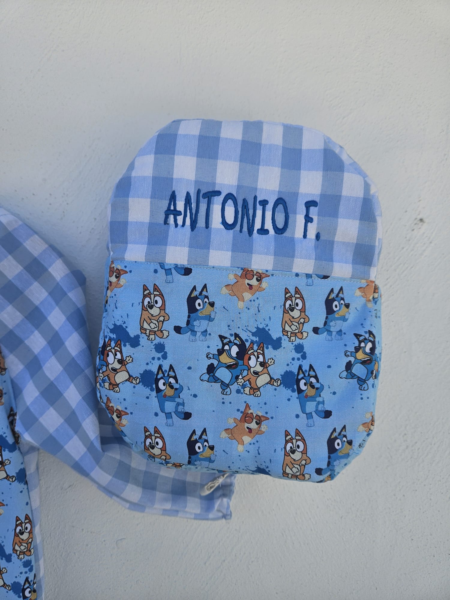 👕 Babi escolar y 🎒 mochila infantil con estampado del divertido personaje Bluey en el cuerpo, combinados con tejido de cuadros vichy en azul en mangas, bolsillo y parte superior de la mochila.