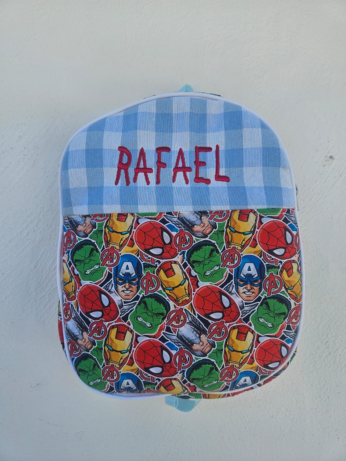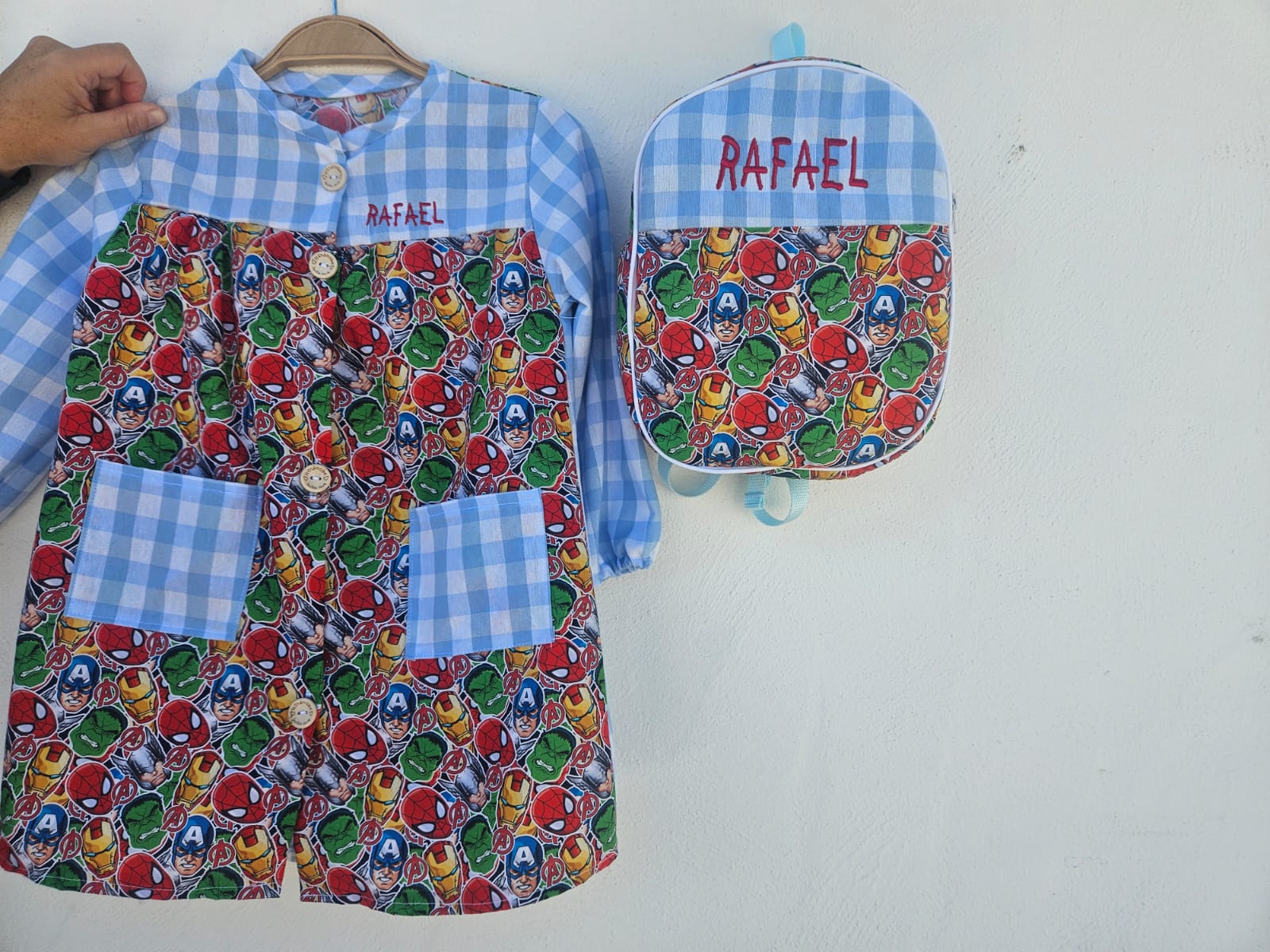 Haz que la vuelta al cole sea divertida y llena de estilo con este precioso pack de babi escolar y mochila infantil personalizados 👕 Babi escolar con estampado de superhéroes (Spiderman, Iron Man, Hulk y Capitán América) en el cuerpo, combinado con tejido de cuadros vichy azul en mangas, parte superior y bolsillos 🎒 Mochila infantil a juego, ligera y práctica, con el mismo estampado de superhéroes y detalles en cuadros vichy azul.