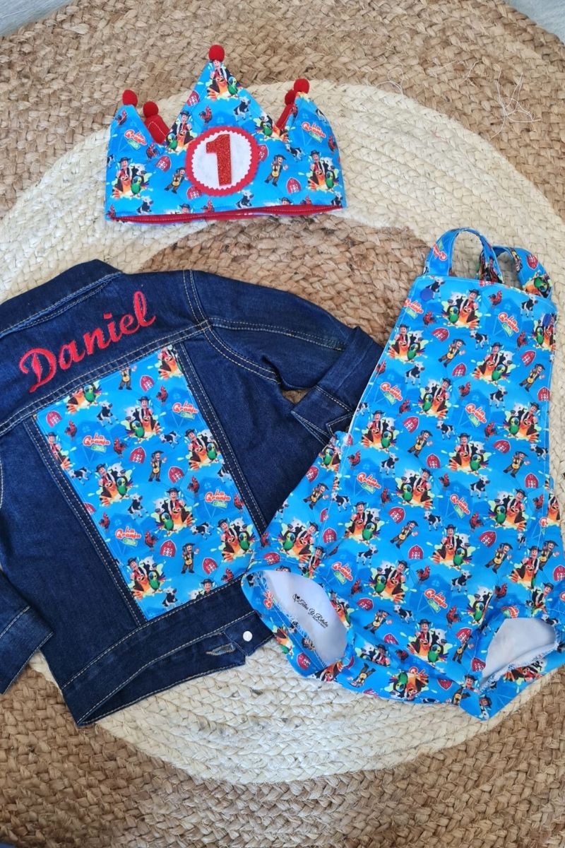 Este conjunto de cumpleaños está compuesto por corona, chaqueta vaquera oscura y peto. Puedes elegir este mismo conjunto cambiándole el nombre,  la talla y el número de la corona.