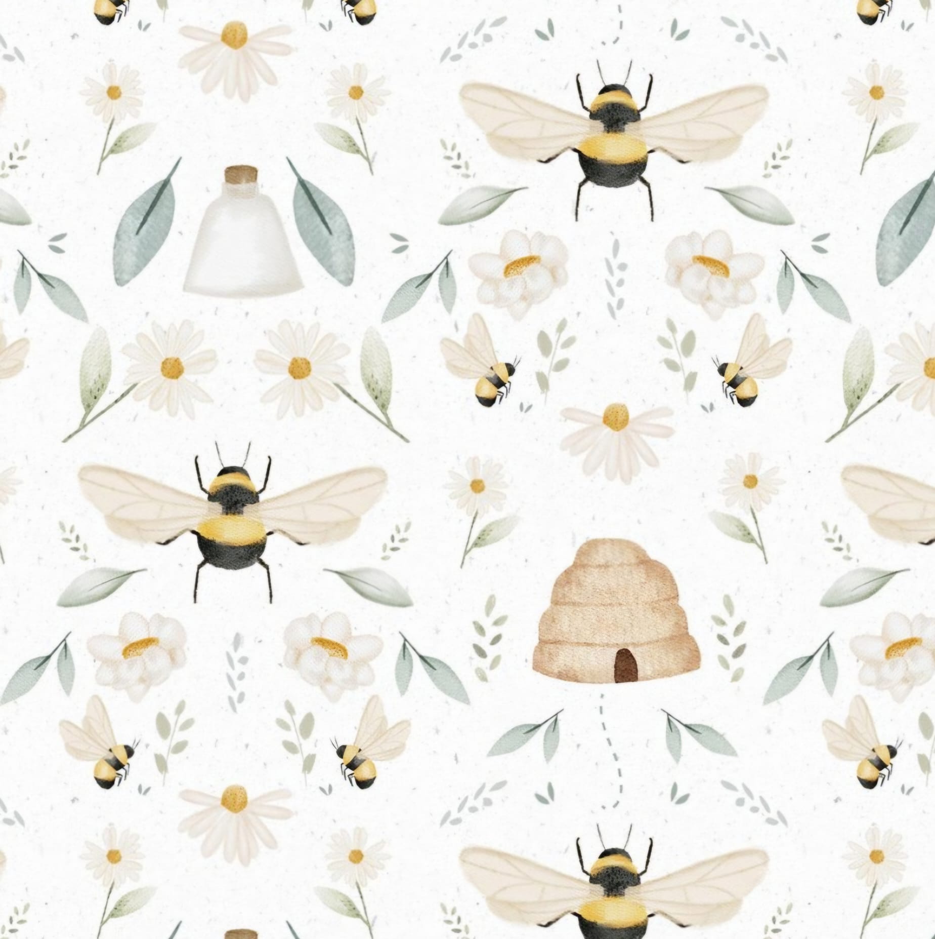 Su fondo blanco salpicado de elementos botánicos y colmenas crea una atmósfera fresca y armoniosa, perfecta para los más pequeños (¡y no tan pequeños!).