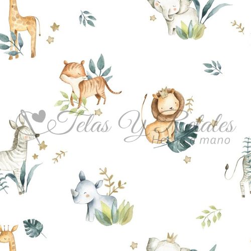 Tela de los animales de la selva. Pedido mínimo de 0,50 metros. El ancho de la tela es de 160 cm. Tela exclusiva de Telas y Retales.