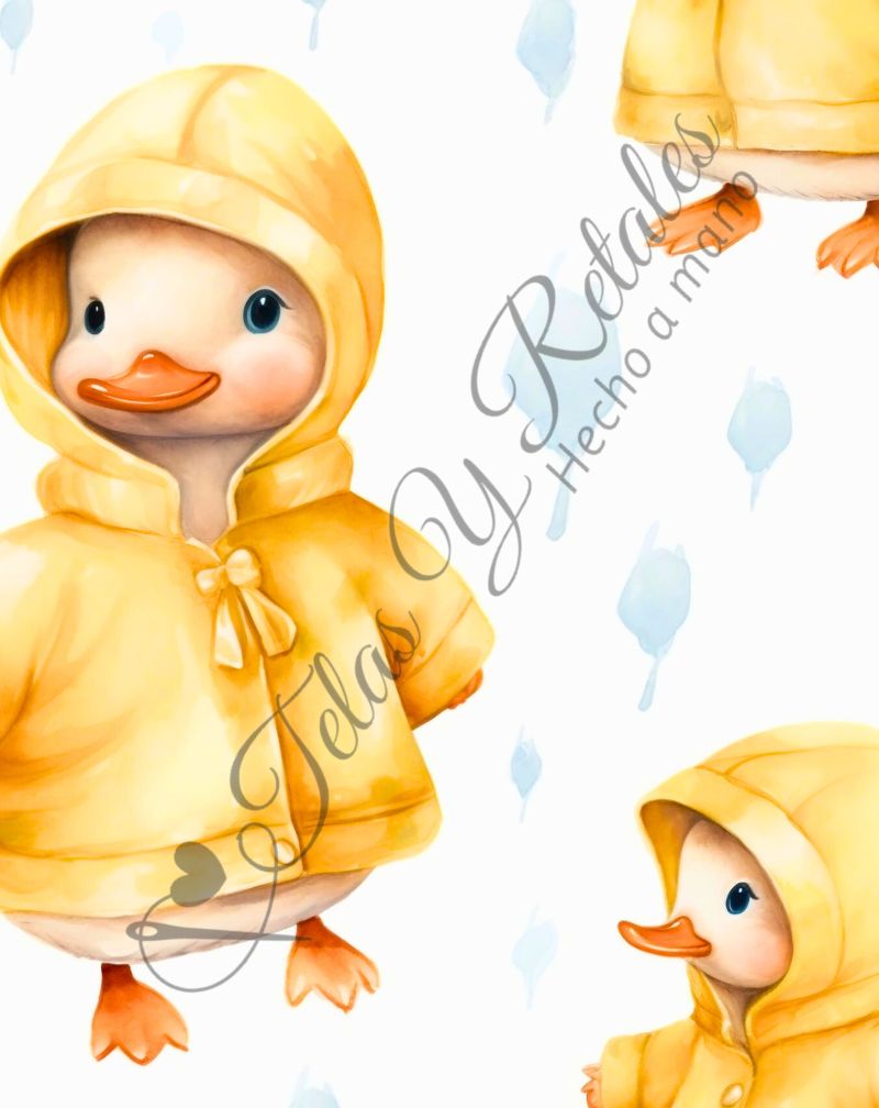 🦆🌧️ Tela diseño “patito con chubasquero amarillo”: alegría bajo la lluvia para tus proyectos de costura ☔
