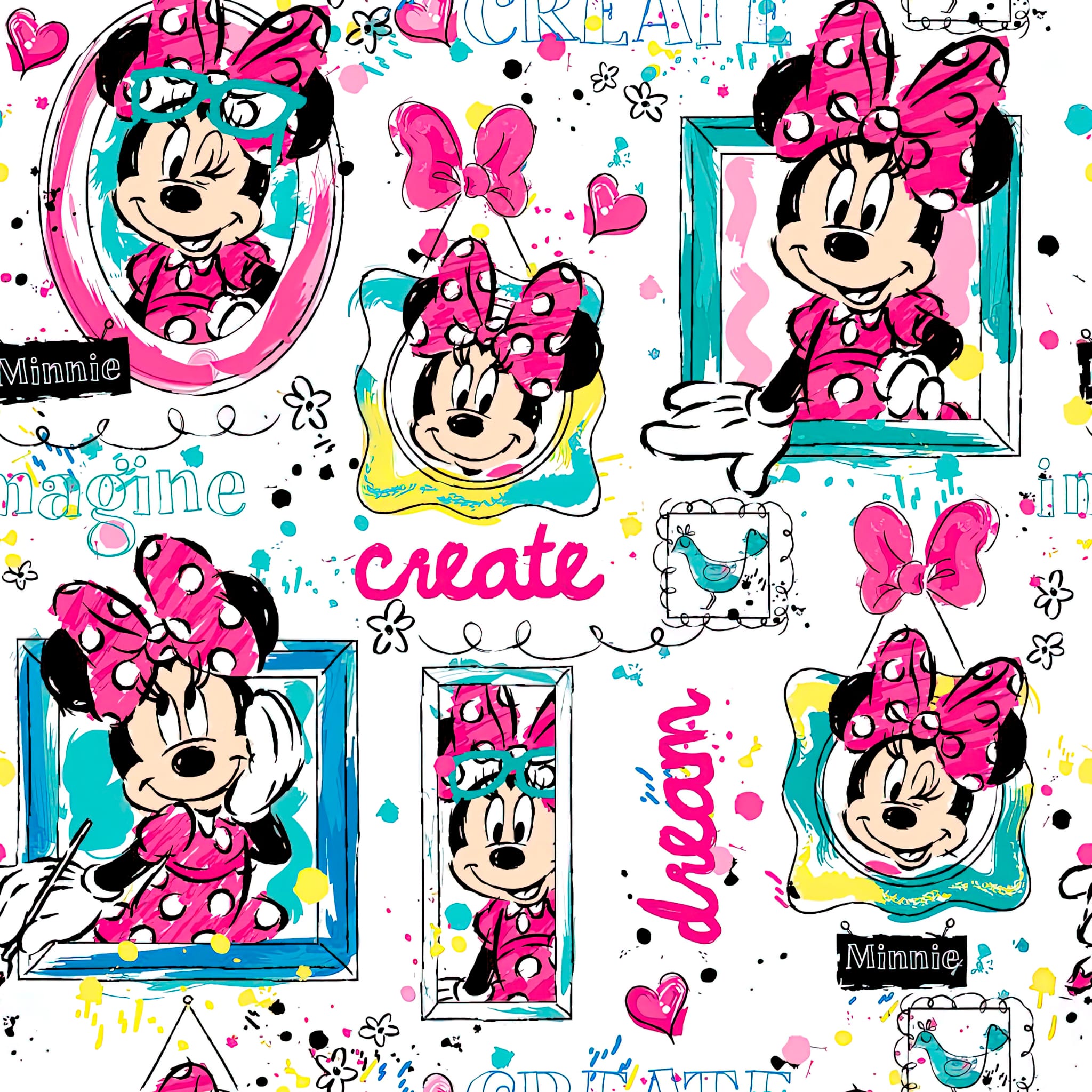 Descubre la adorable Tela Minnie Creativa en www.telasyretales.com, ideal para confeccionar prendas y accesorios infantiles llenos de color, alegría y creatividad. Este diseño exclusivo está protagonizado por Minnie Mouse en un estilo artístico y moderno, con ilustraciones encantadoras enmarcadas, acompañadas de palabras inspiradoras como «imagine», «create» y «dream», en una paleta vibrante de rosa, azul y amarillo.