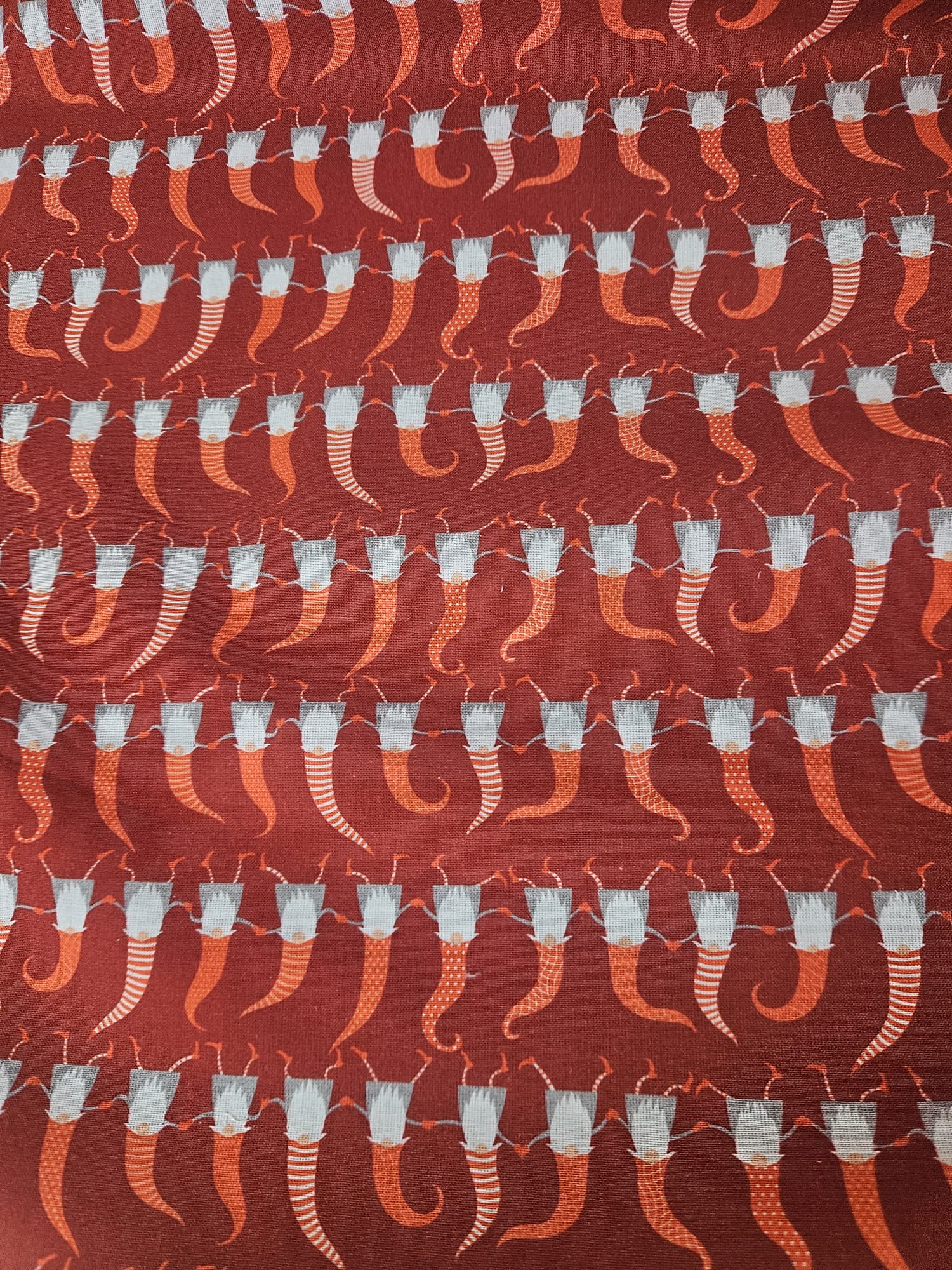 Nuestra Tela Navideña Elfos Divertidos destaca por su original y simpático estampado de pequeños elfos en tonos rojizos, cada uno con patrones únicos (rayas, puntitos y lisos) y un toque caricaturesco que transmite diversión y energía. Sobre un fondo rojo cálido, estas pequeñas figuras parecen saltar y bailar, creando un diseño dinámico, juguetón y perfecto para dar vida a tus creaciones.