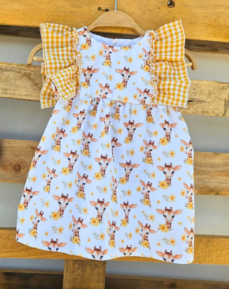 👗 Vestido jirafa con braguitas a juego – Moda infantil artesanal en www.telasyretales.com 🦒✨