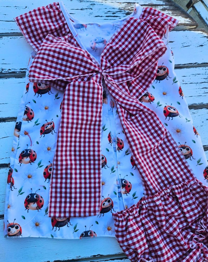 El vestido mariquita presenta un estampado de mariquitas que captura la esencia de la naturaleza y la diversión. Combinado con un cuadro vichy rojo en las braguitas a juego, el conjunto ofrece un look adorable y lleno de energía. El vestido, sin mangas y con un corte fluido, permite a tu pequeña moverse con total libertad mientras disfruta de su día. Los detalles como los volantes en el bajo del vestido y los lazos le dan un toque extra de ternura.