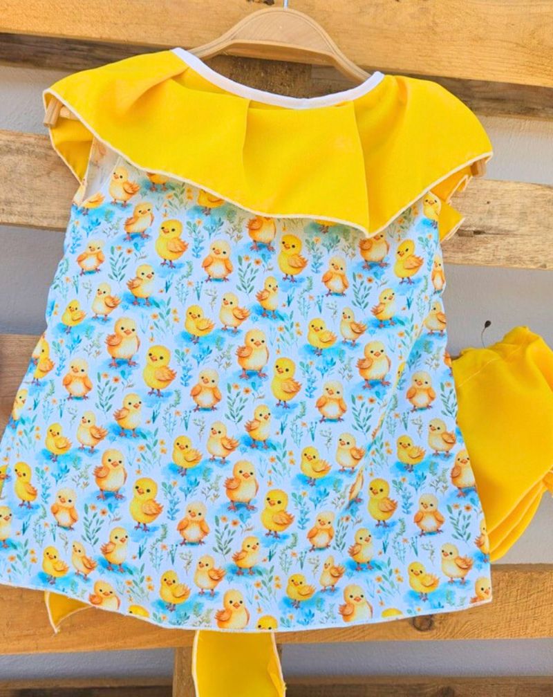 Vestido pollito con braguitas amarillas – Moda infantil artesanal en www.telasyretales.com 🐣💛