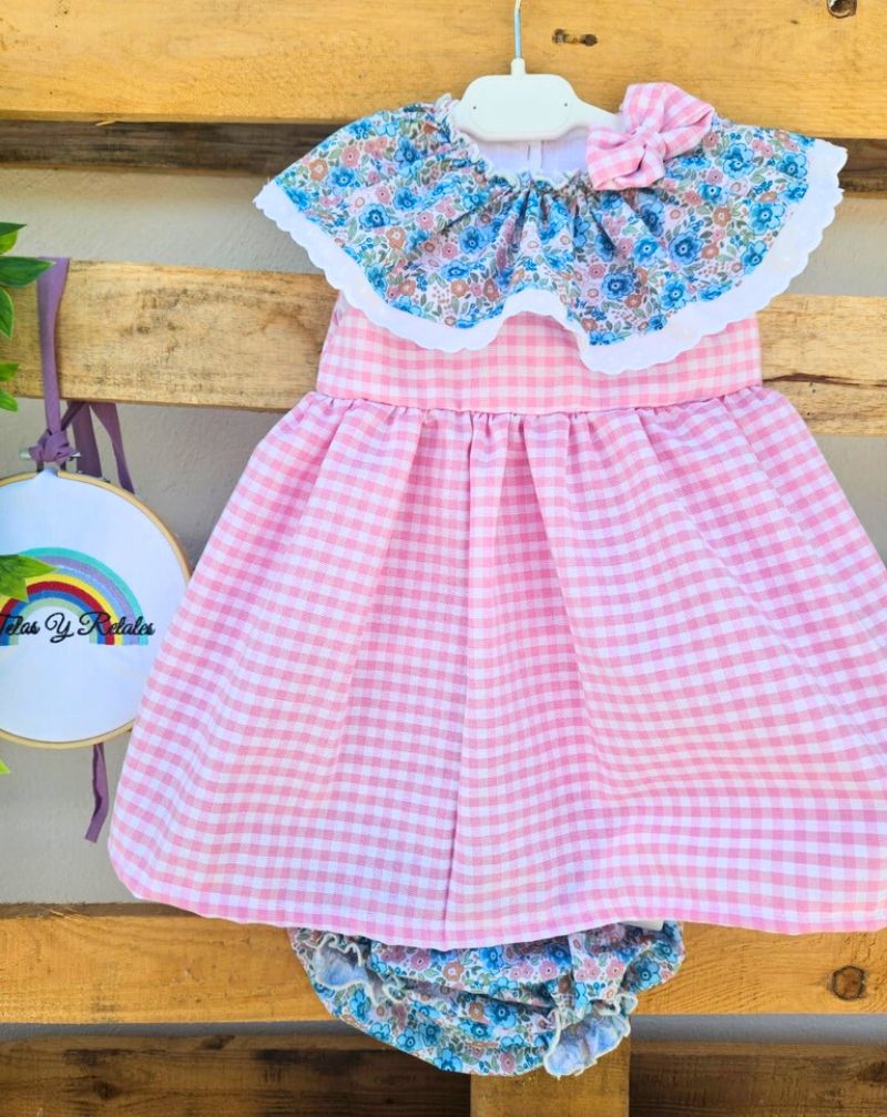 🌸 Vestido vichy rosa con braguitas y cuello estampado flores – Moda infantil artesanal 🌸